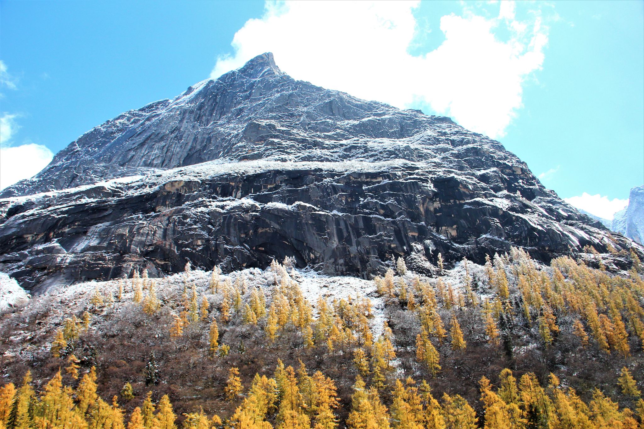 At Zhenzhuhai, we could have a good view of Xiannairi (仙乃日), at 6,032 m, the highest of the 3 sacred peaks in the reserve. Unfortunately due to the clouds we could only have a partial view.